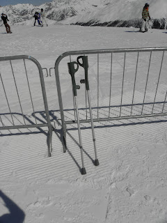 Så från tisdagen fram till i torsdags har jag och mina nya italienska kompisar (kryckor) suttit i solen på olika toppar i byn och njutit av solen medan Micke har farit nerför backarna. (Tro mig jag har varit väldigt sugen på att kasta dessa kryckor åt fanders och sätta på mig skidorna).